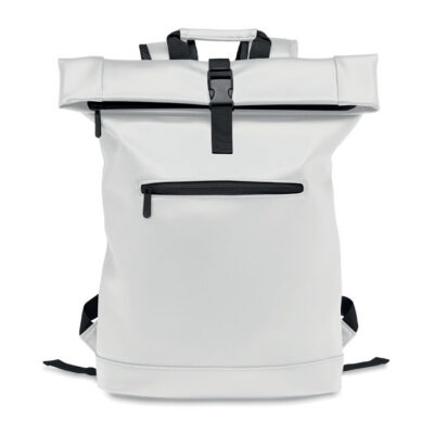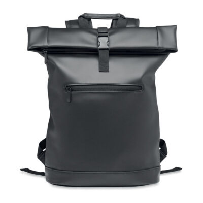 15 inch rolltop laptop backpack in soft PU with padded back and reinforced base. Large front zipped pocket. The lining is 210D RPET.