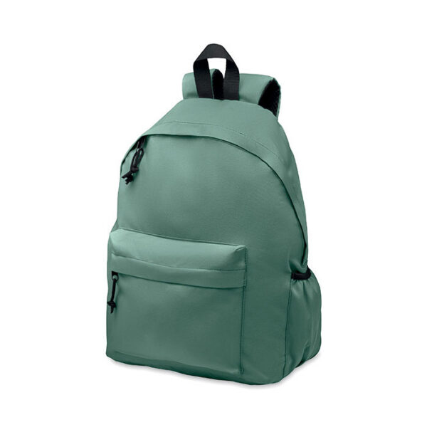 Backpack in 600D RPET polyester with outside pocket with zipper. Padded back and has a side bottle compartment.
