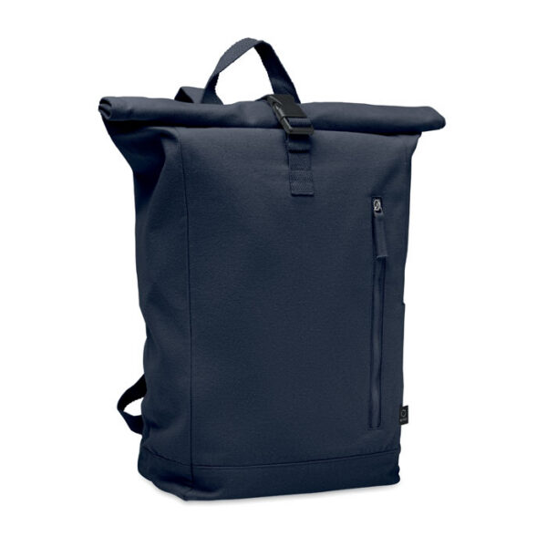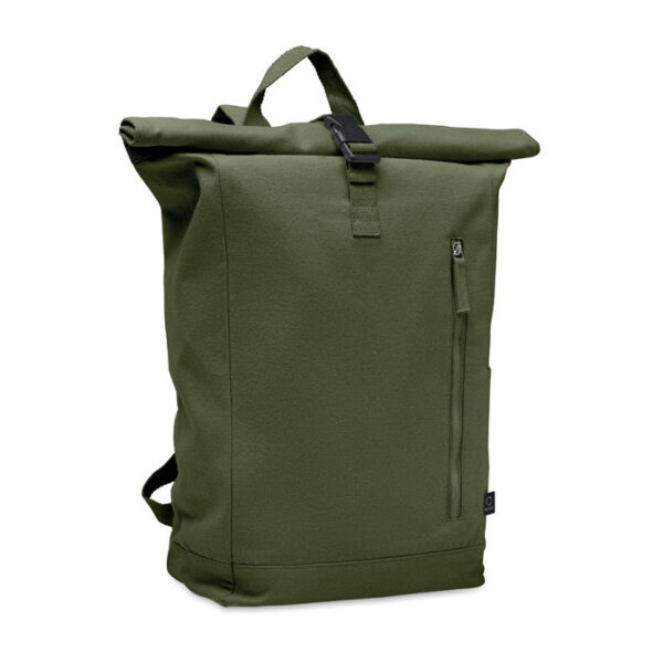 Roll top backpack with hook and loop closure in 390 gr/m² recycled cotton (80%) and recycled polyester (20%). Zippered front pocket.