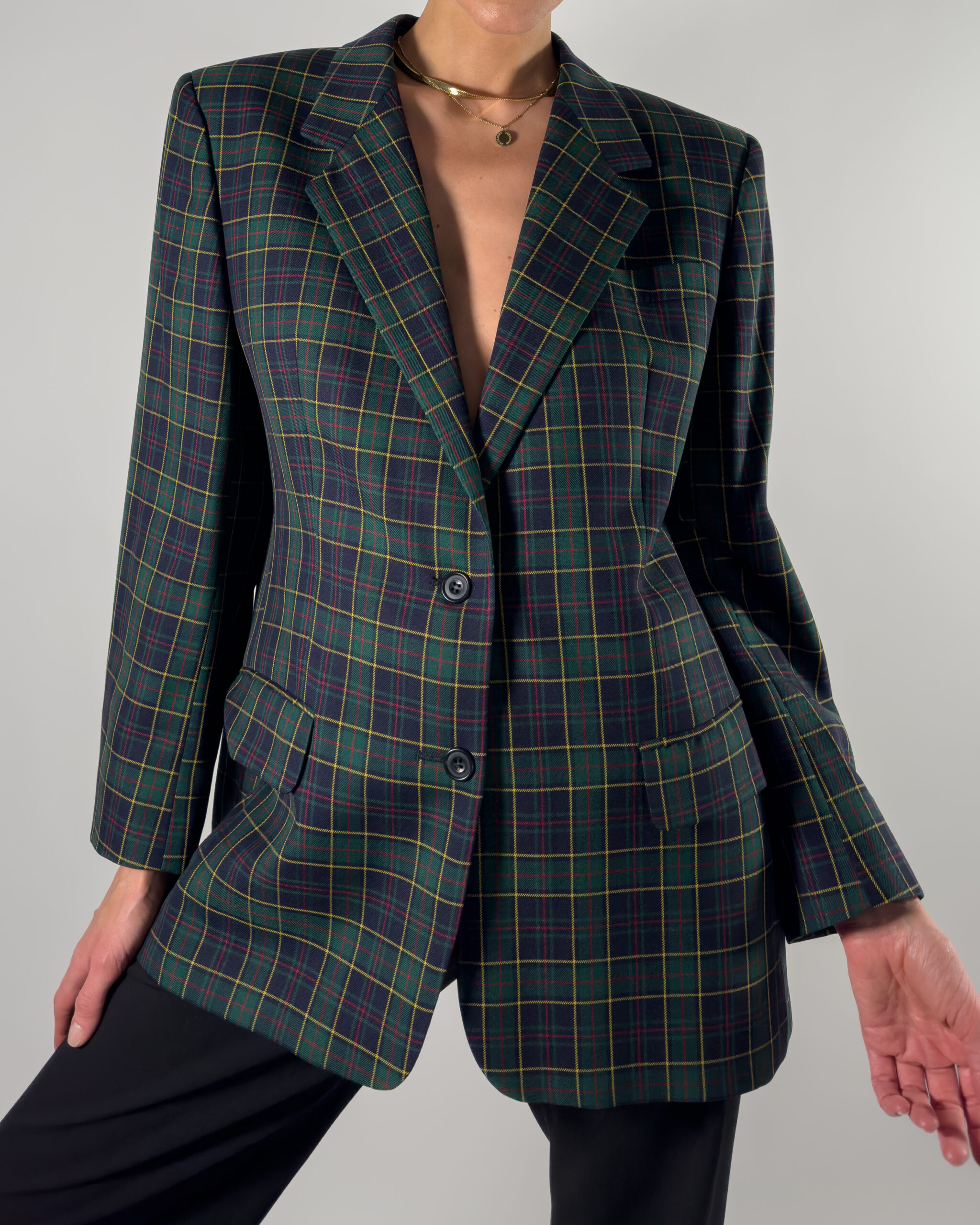 Classic checkered wool blazer from DAKS London, timeless design in dark blue and green. Made in Great Britain.