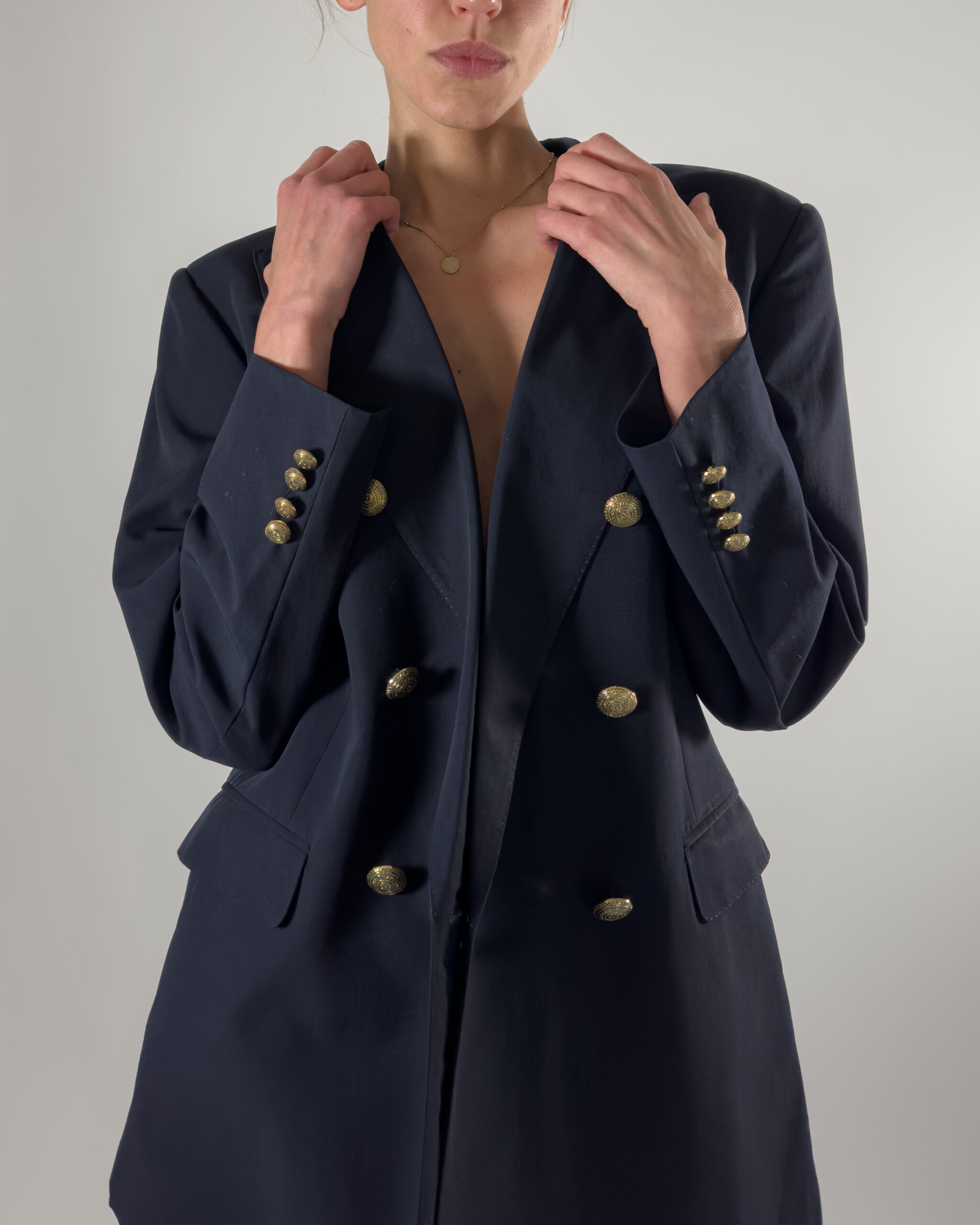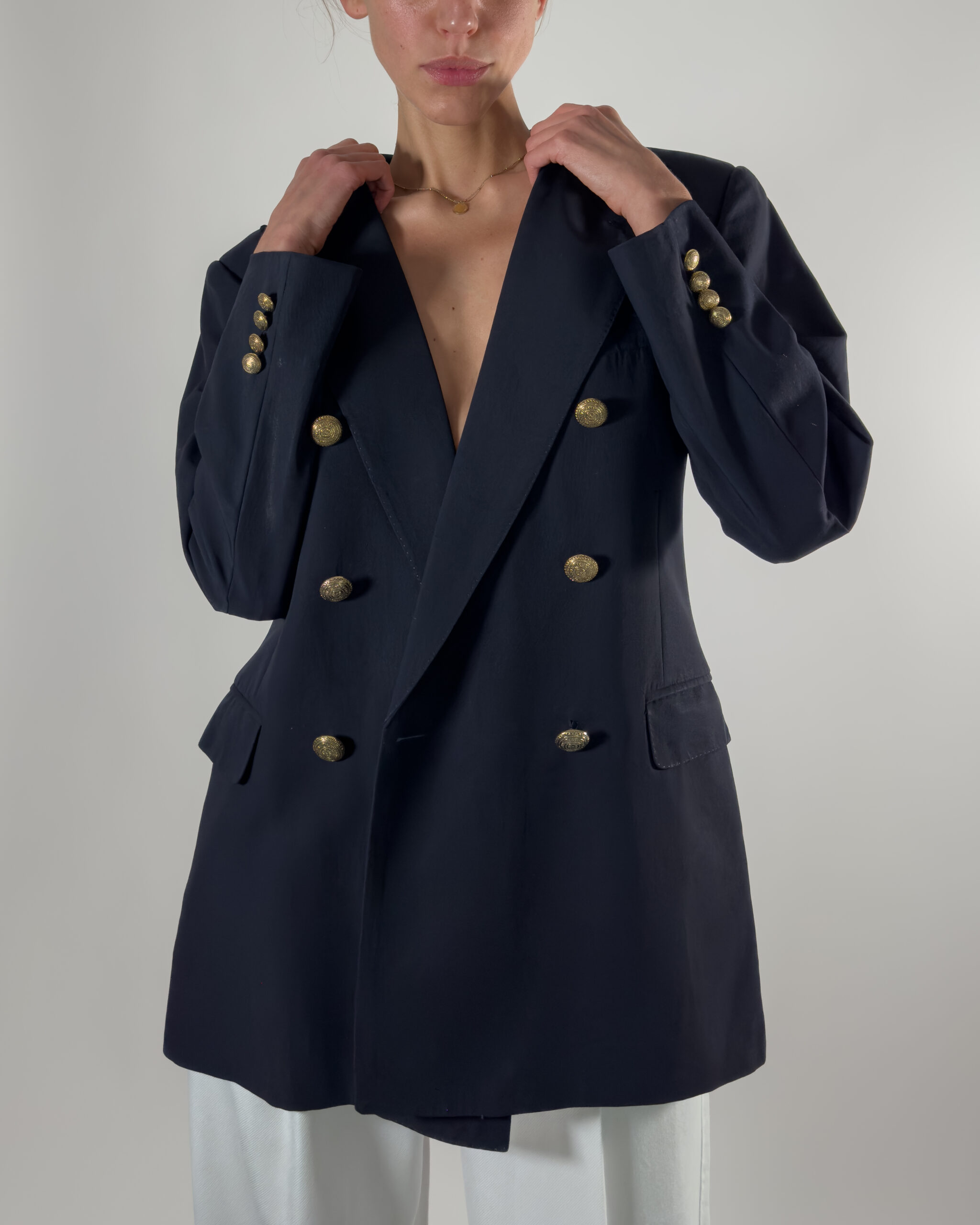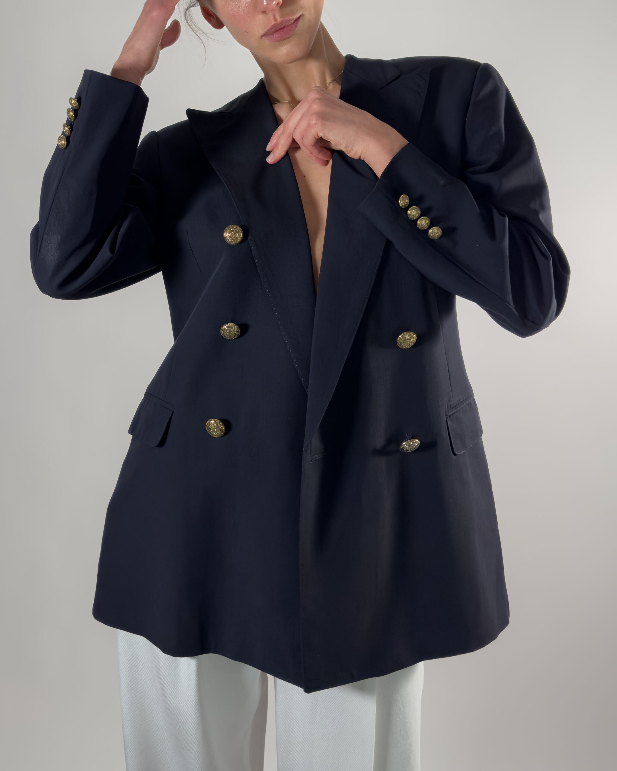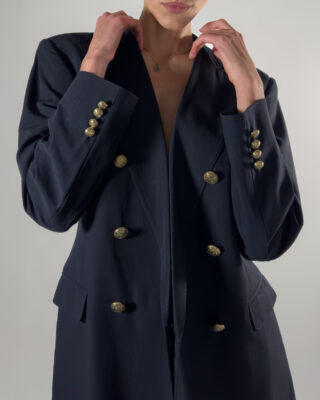 • Double-breasted design with gold-tone buttons