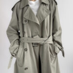 Made from a structured cotton-blend, this vintage trench coat features a timeless double-breasted cut with classic storm flaps, epaulettes, and a belted waist. The light sage-grey tone is enhanced by marbled buttons and adjustable cuff details.