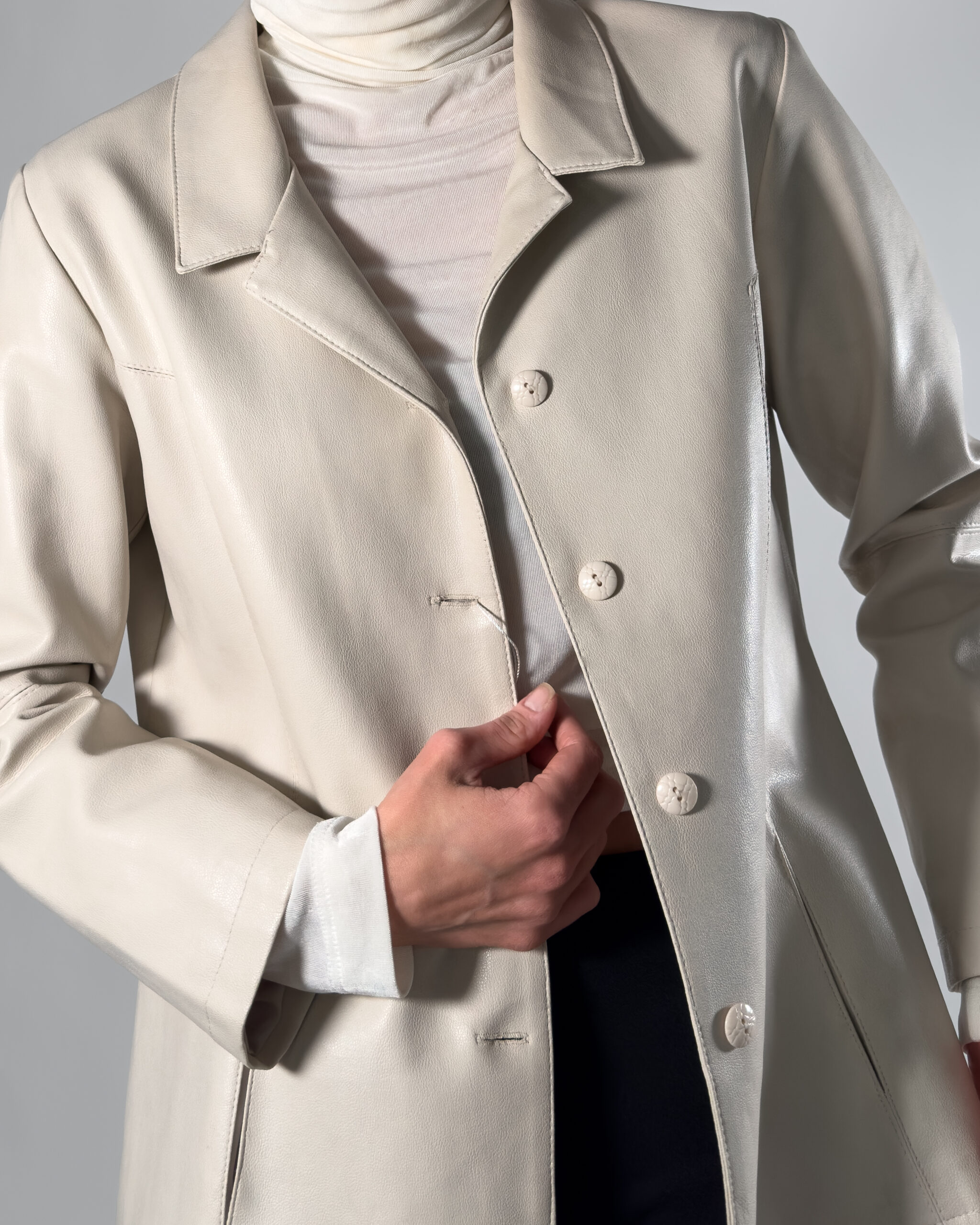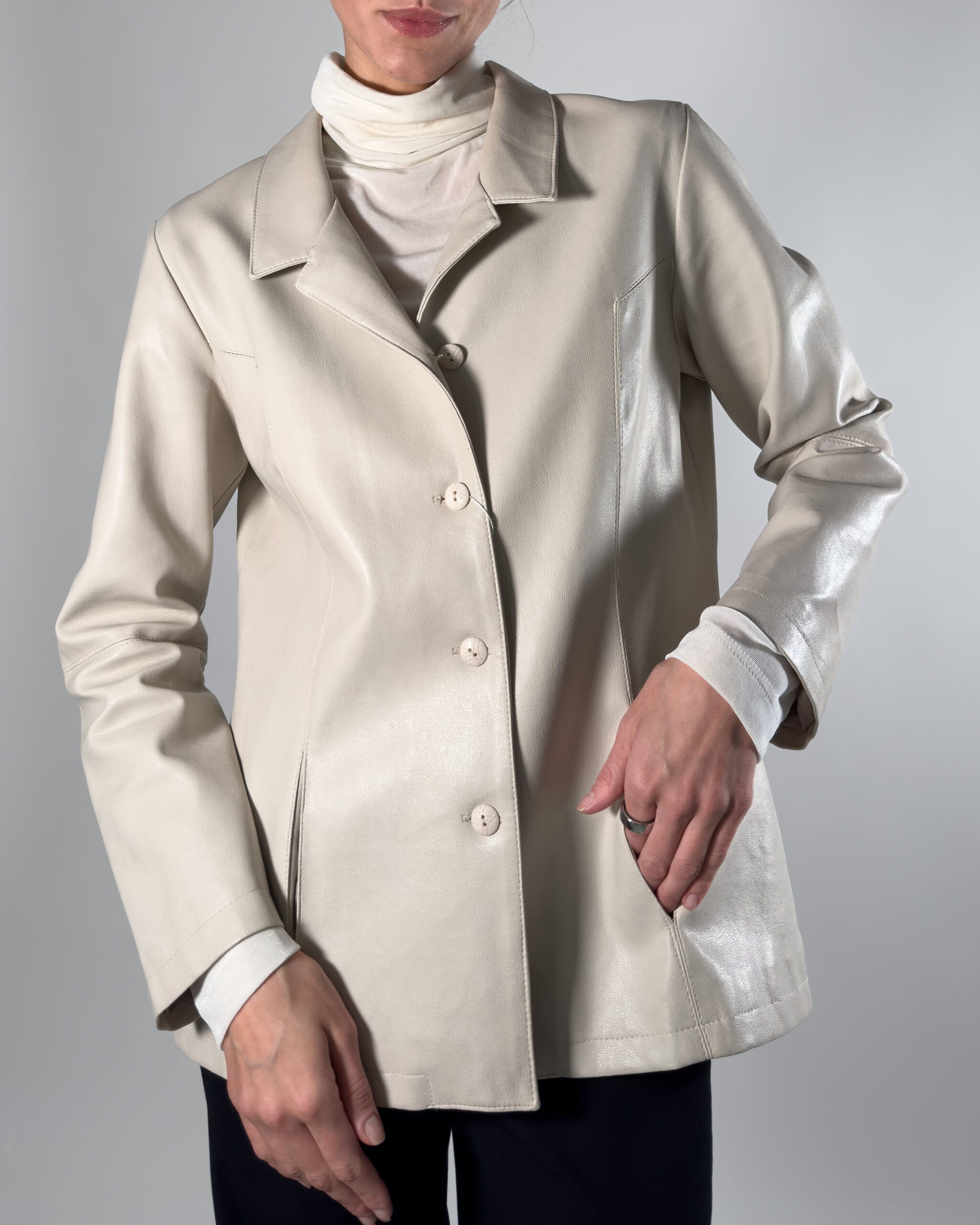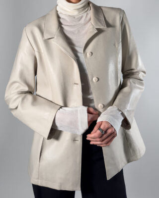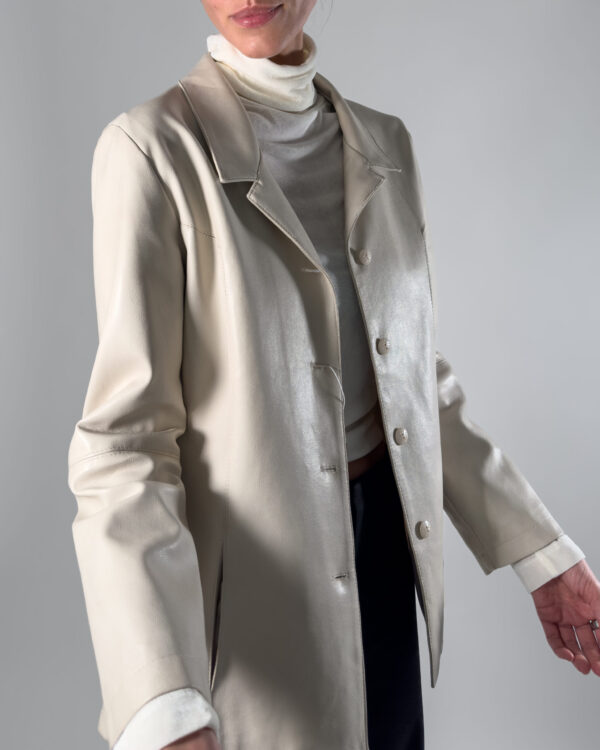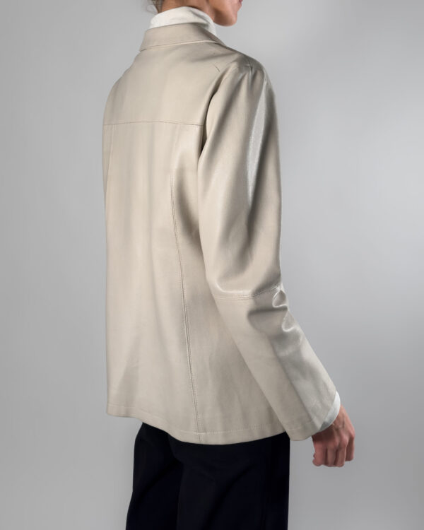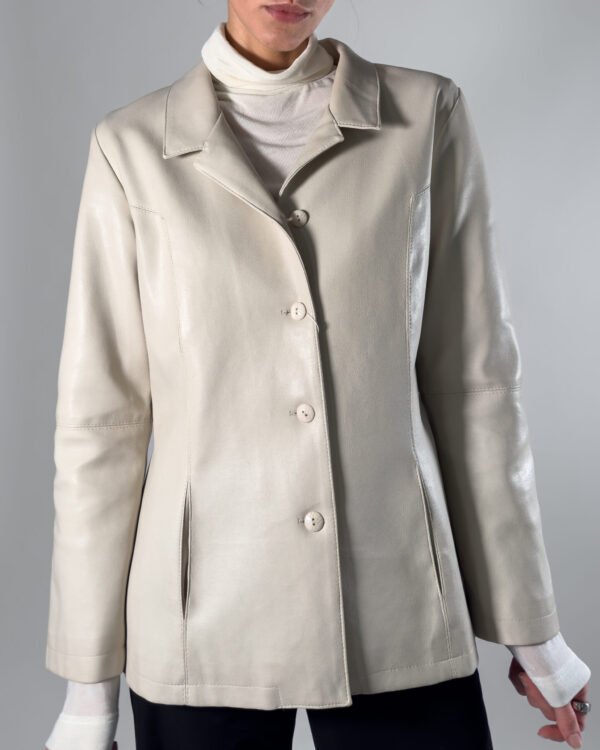 Genuine leather jacket in soft cream white hue. By Delban, this leather jacket features a collar, button up closure and two front pockets. Labelled as size 44, Made in Spain.