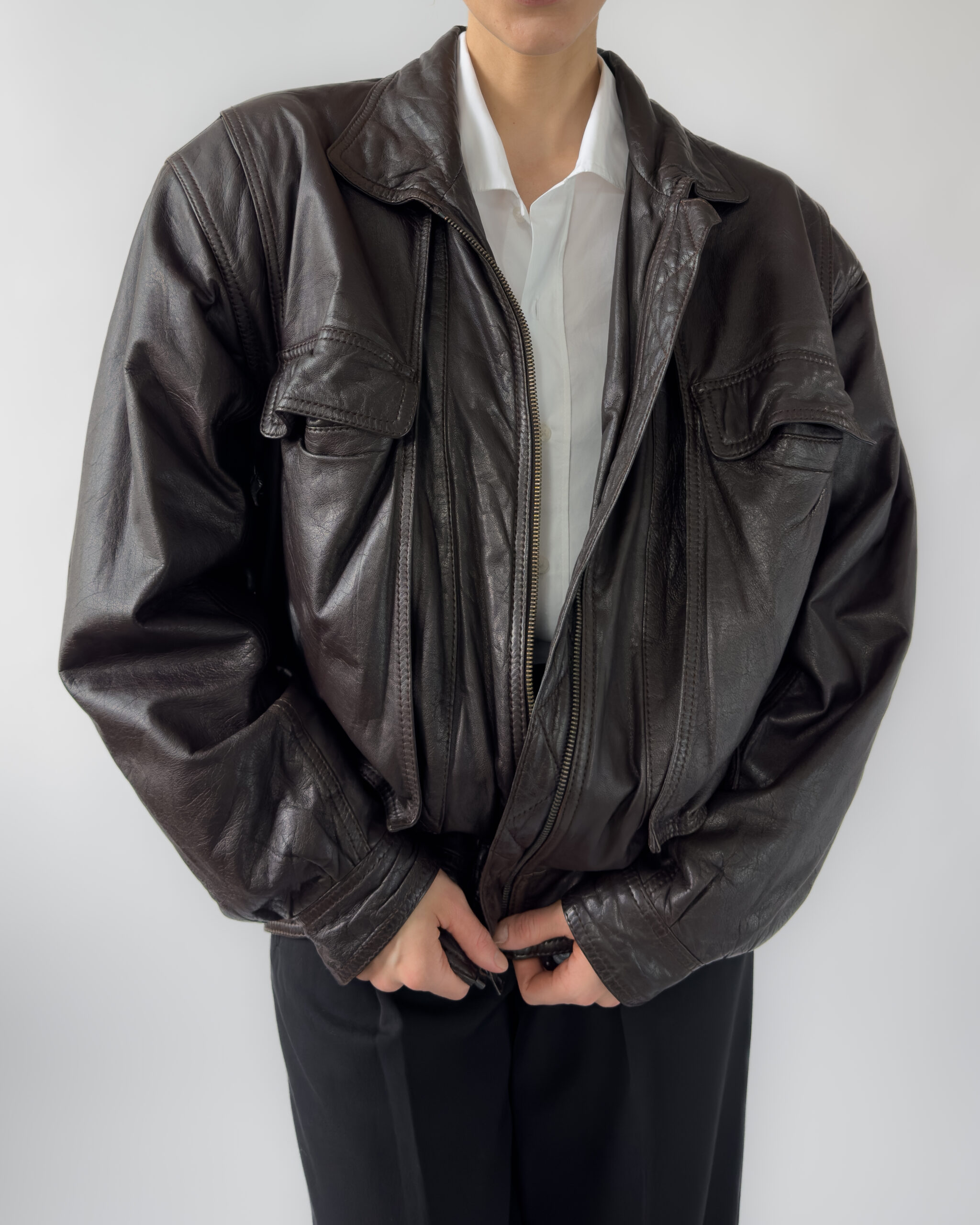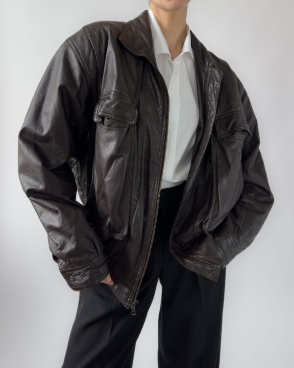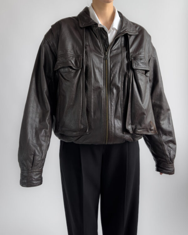 Made from lambs leather, this bomber jacket features a relaxed, cocoon-like silhouette with exaggerated volume. Designed with functional pockets and a zip-front closure