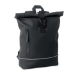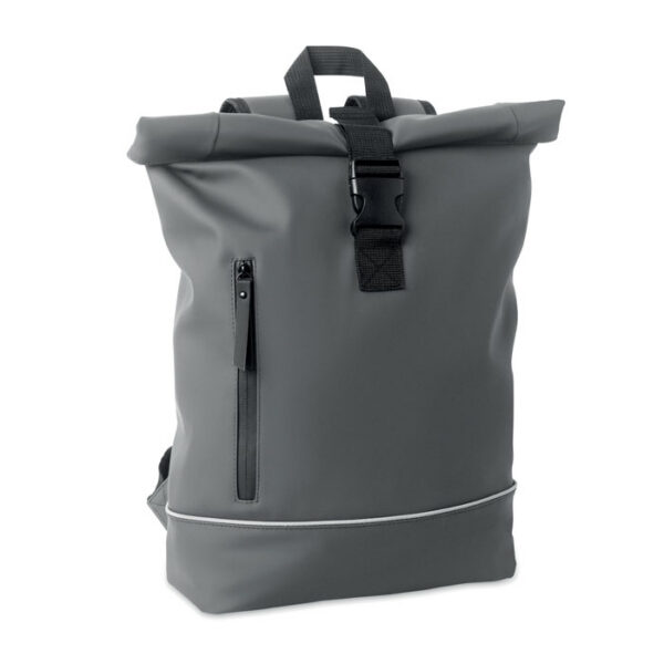15 inch roll top laptop backpack in soft PU with padded back and base reinforcement with reflective strip. Waterproof zippered front pocket. 210D RPET polyester lining.