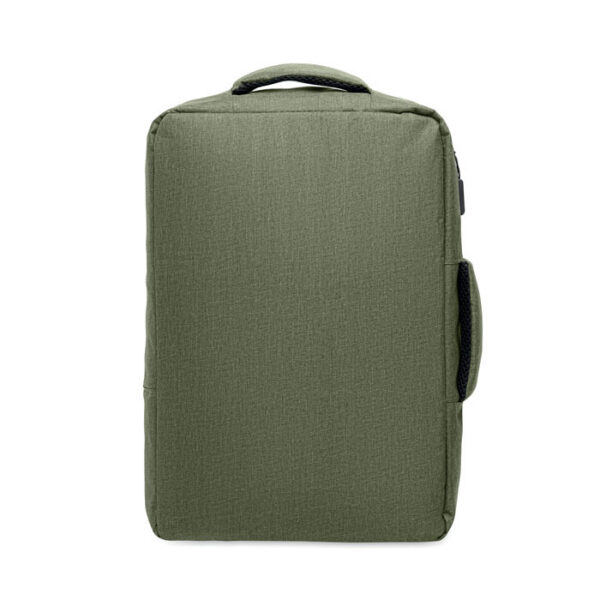 Slim 15 inch laptop backpack in 300D RPET with safe 180 degree opening with 210D RPET lining. Includes laptop compartment, 2 internal slip pockets, 2 internal pen pockets and 2 padded carry handles. Soft padded back and shoulder straps. Suitcase sleeve.