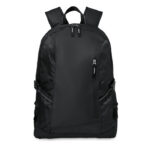 15 laptop backpack in 600D with rip stop details. Includes one internal 15 laptop compartment, one main front zippered pocket and 2 side compartments. Adjustable shoulder strap.