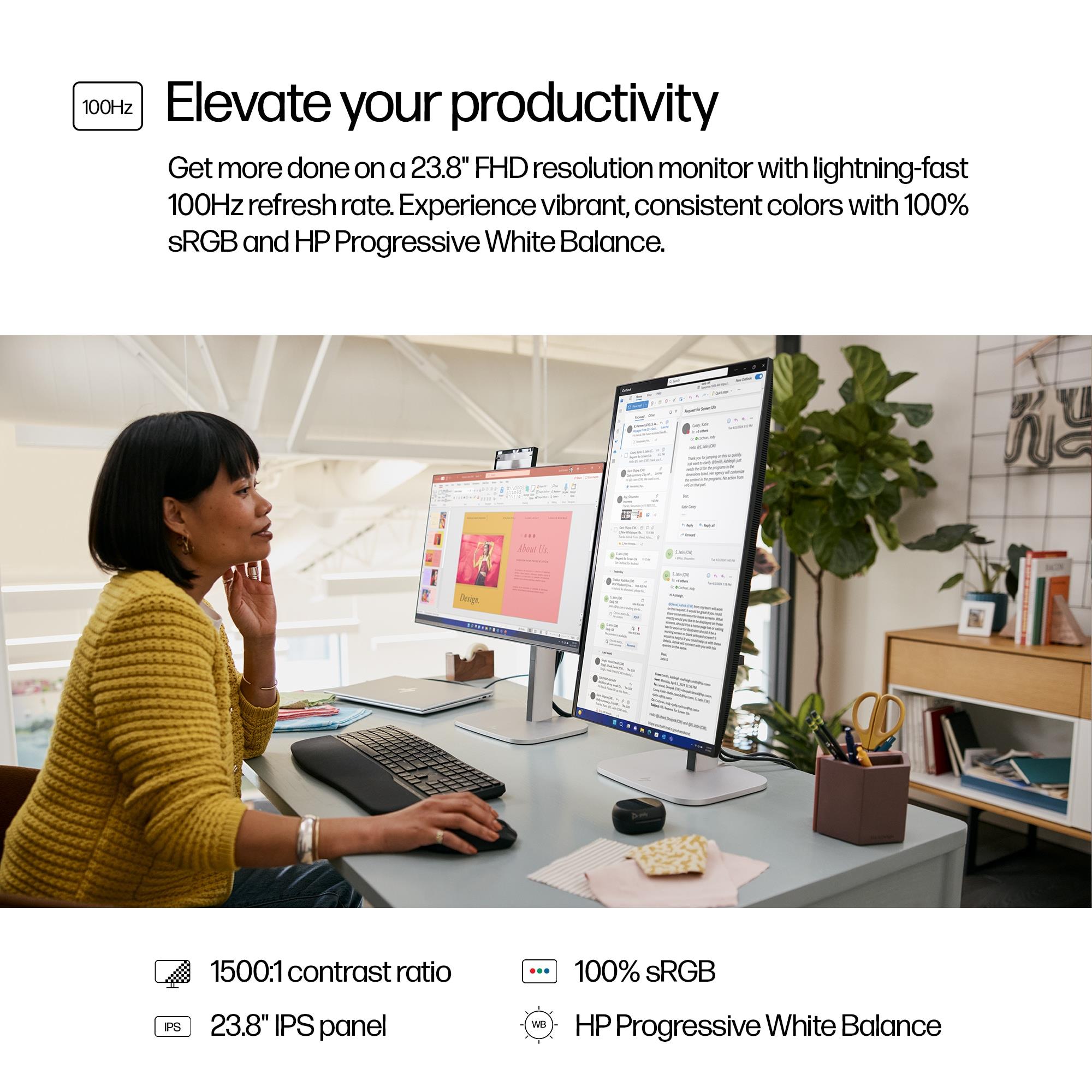 • Get more done on this 23.8″ FHD resolution monitor with 100 Hz refresh rate[1]. Experience vibrant, consistent colors with 100% sRGB[1] and HP Progressive White Balance.[2]