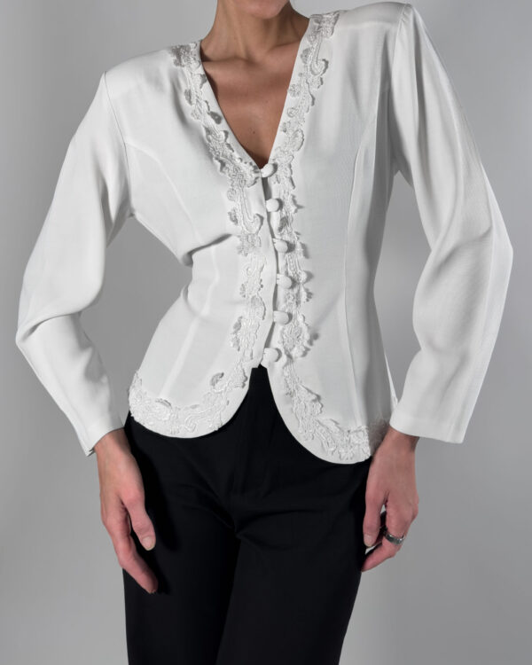 Blondie&Me blouse with timeless silhouette, Made in the USA. Featuring embroidery along the button-up front, adjustable back for a flattering fit. Soft blend of acetate and rayon, the blouse feels light and smooth against the skin.