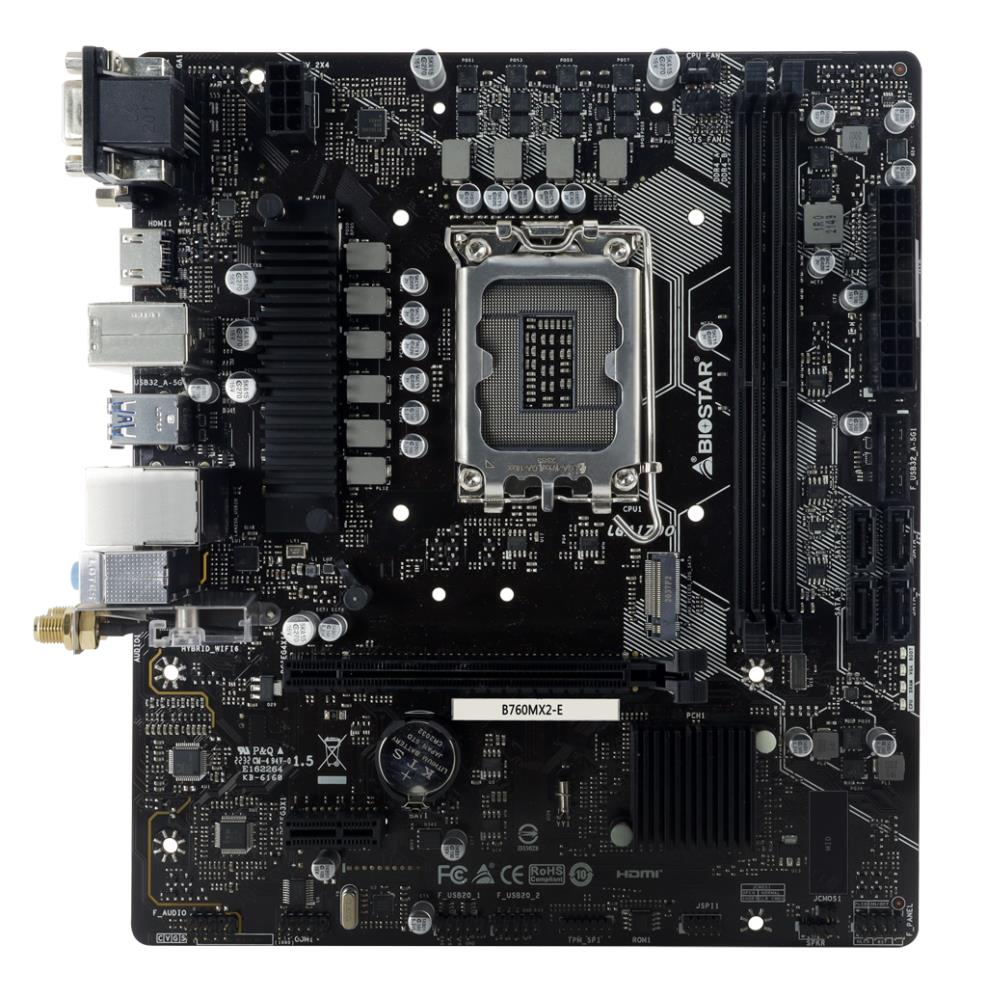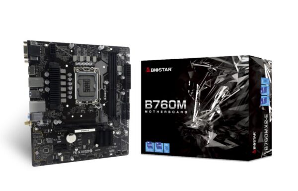 Mainboard|BIOSTAR|Intel B760 Express|LGA1700|Micro-ATX|Memory DDR5|Memory slots 2|1xPCI-Express 3.0 1x|1xPCI-Express 4.0 16x|2xM.2|1x15pin D-sub|1xDVI-D|1xHDMI|4xUSB 2.0|2xUSB 3.2|1xPS/2|1xRJ45|3xAudio port|B760MX2-E