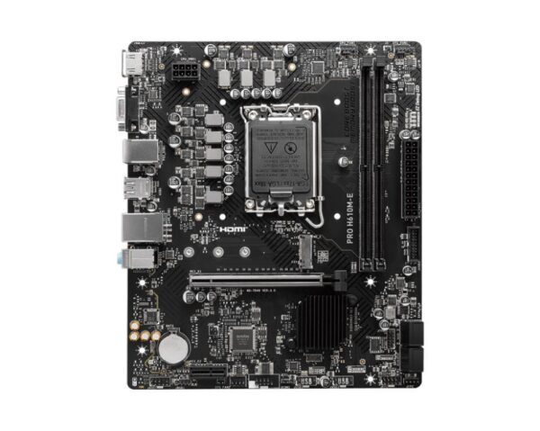 Mainboard|MSI|Intel H610|LGA1700|Micro-ATX|Memory DDR5|Memory slots 2|1xPCI-Express 1x|1xPCI-Express 16x|1xM.2|1x15pin D-sub|1xHDMI|4xUSB 2.0|2xUSB 3.2|1xPS/2|1xRJ45|3xAudio port|PROH610M-E