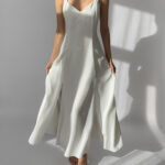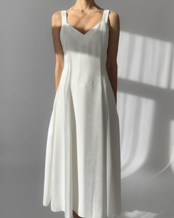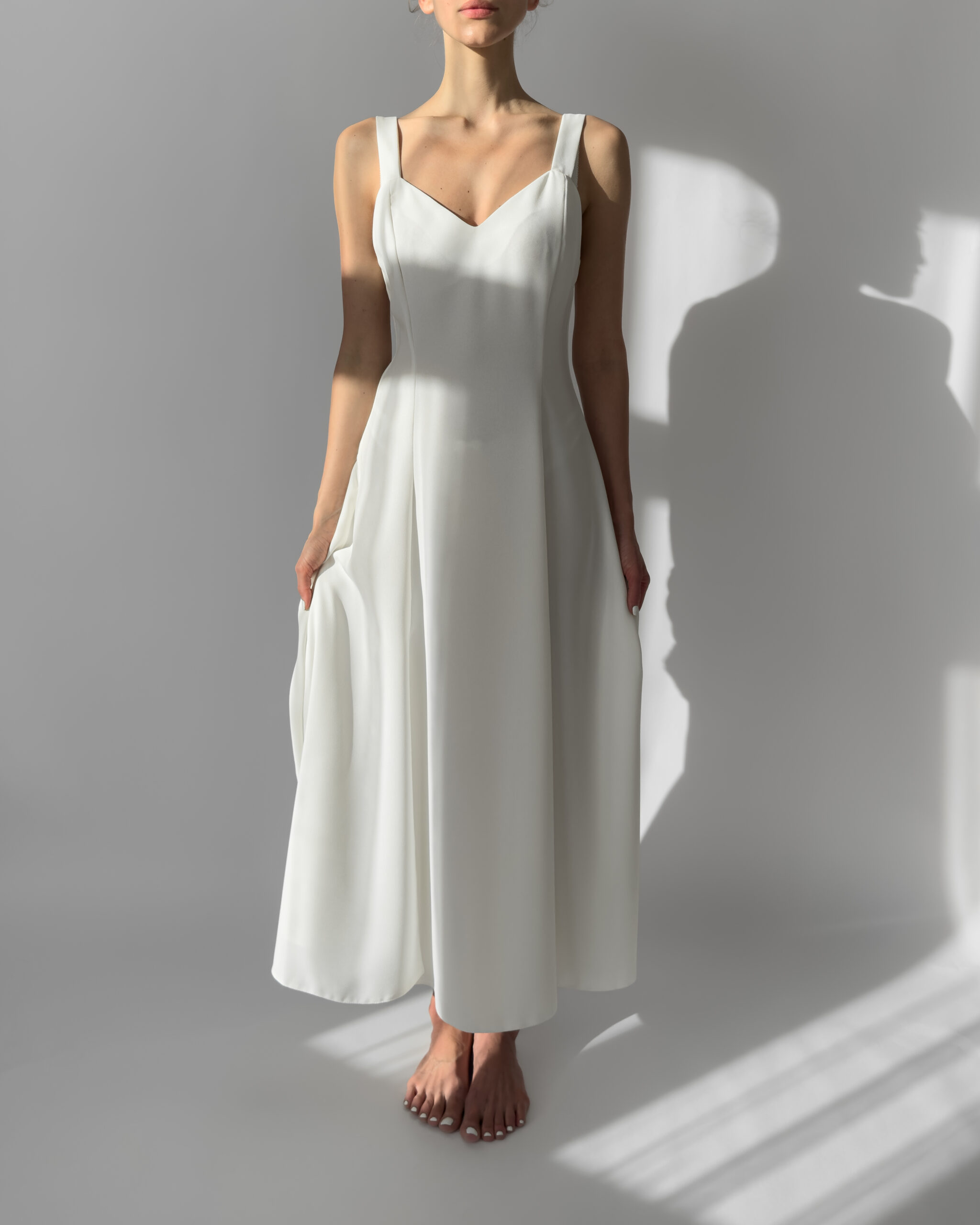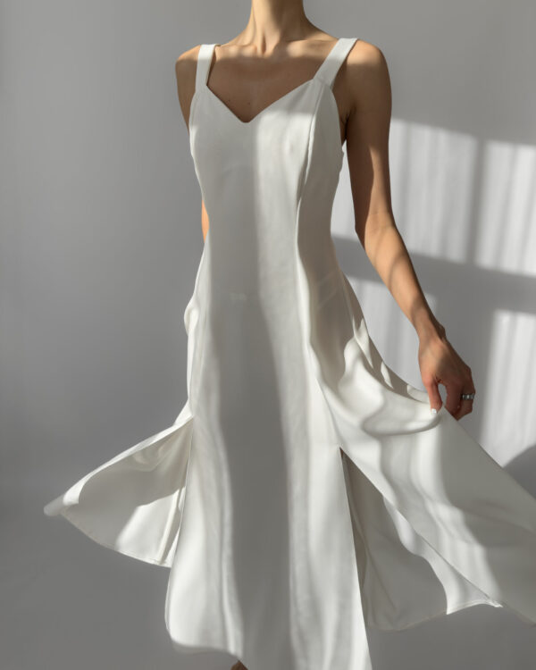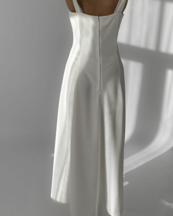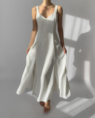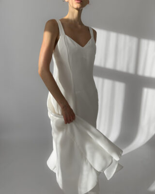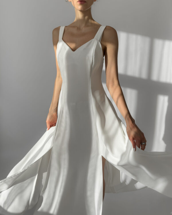 Joy white maxi dress with a flowing silhouette and two subtle front slits. Features wide straps, a flattering neckline, and a back zipper closure. Perfect for summer evenings or as a minimalist bridal option. Made in UK