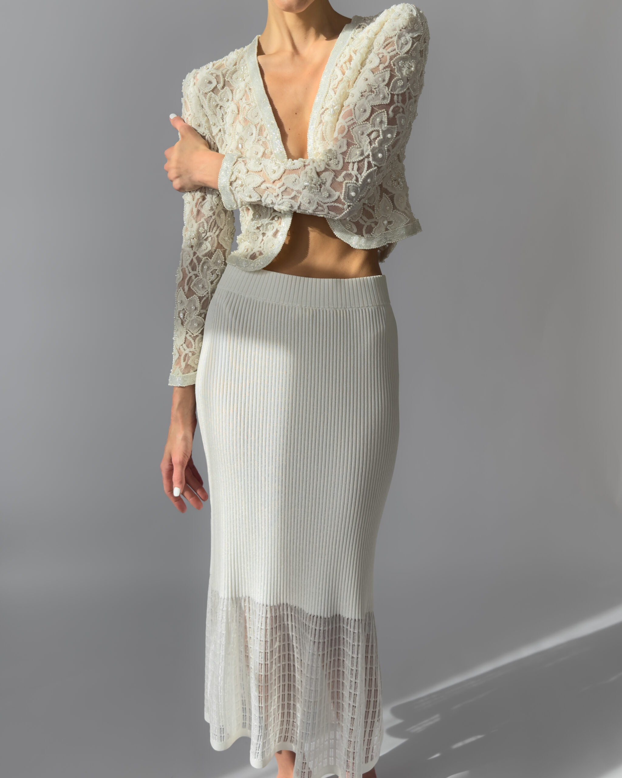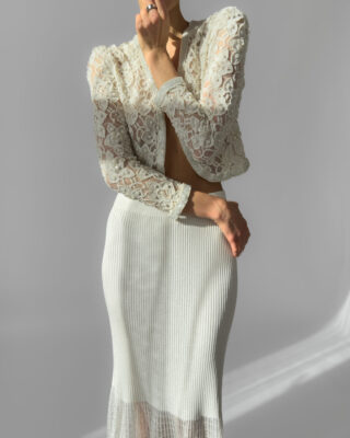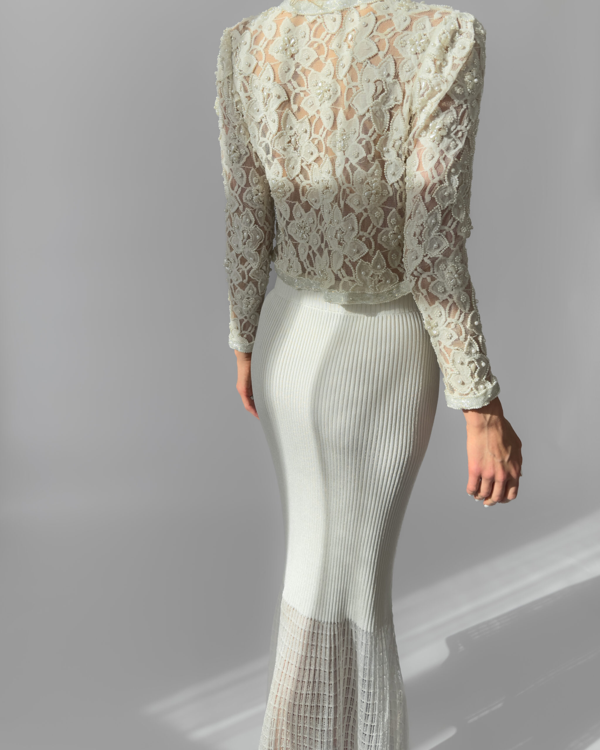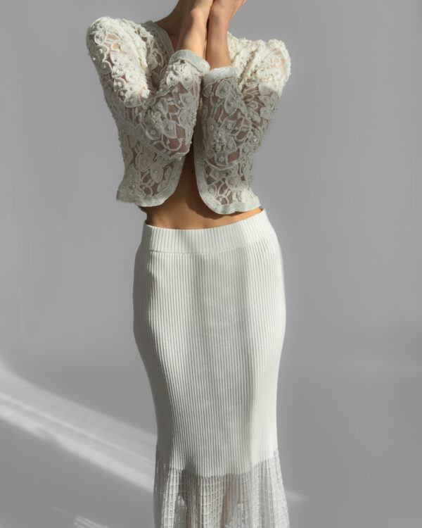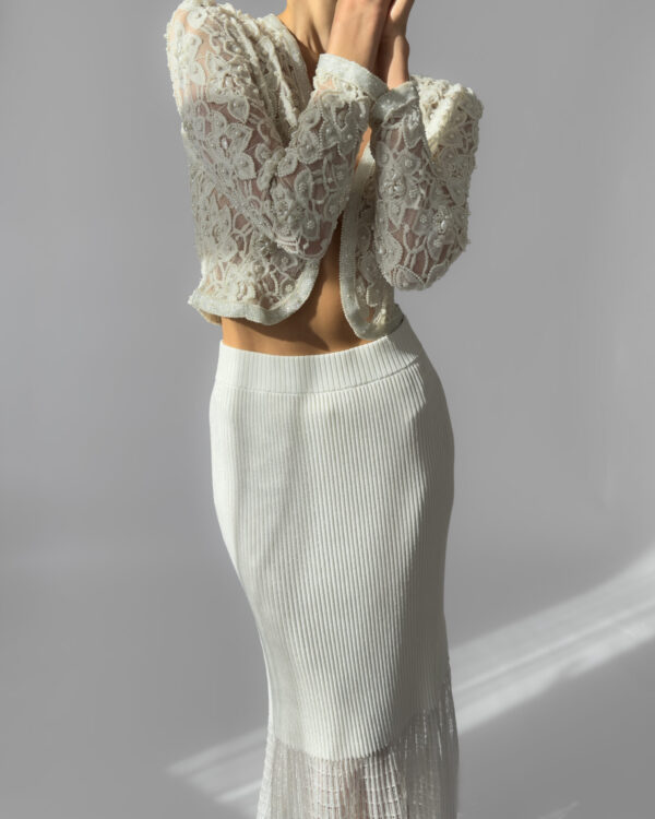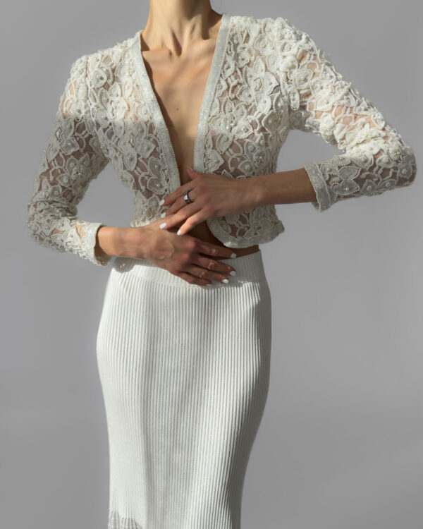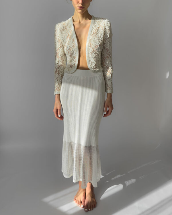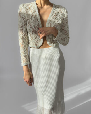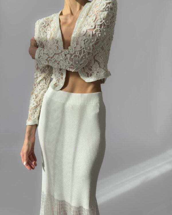 Exquisite cream lace jacket fully embroidered with pearls, featuring delicate floral motifs and a slightly cropped silhouette. This high-quality, possibly handmade piece is perfect for weddings, evening events, or as a unique statement layer. In perfect vintage condition.