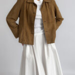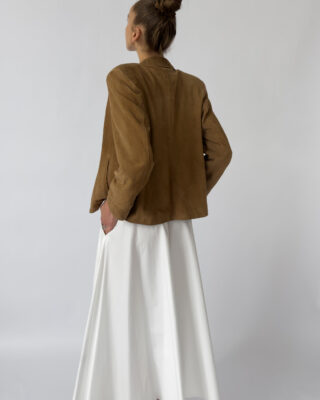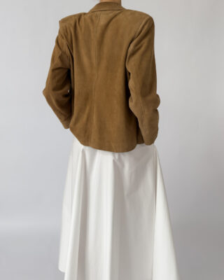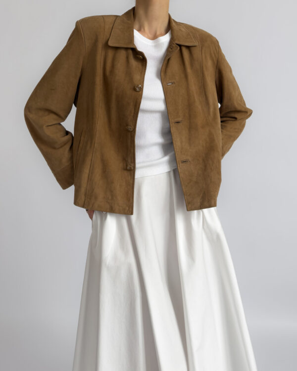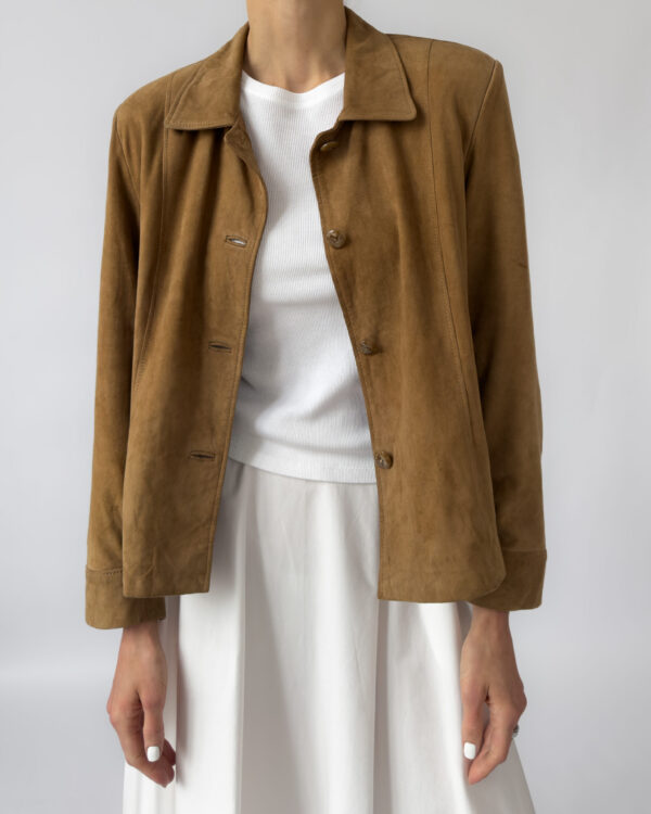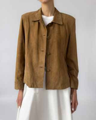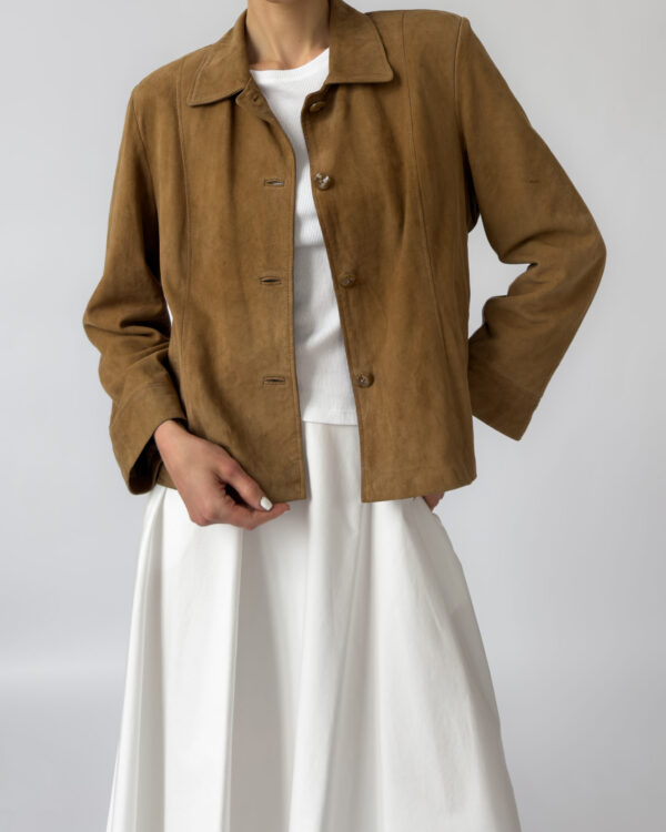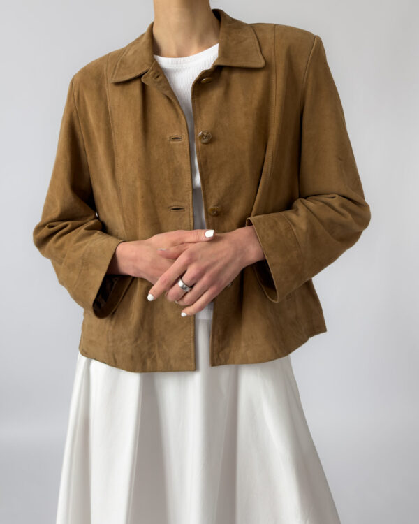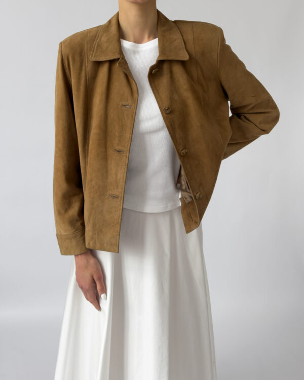Labelled as Golden Cuir, article de luxe. This Pierre Cardin suede jacket features a button-up closure, silky golden lining, two front pockets, light shoulder pads, and a classic collar.