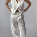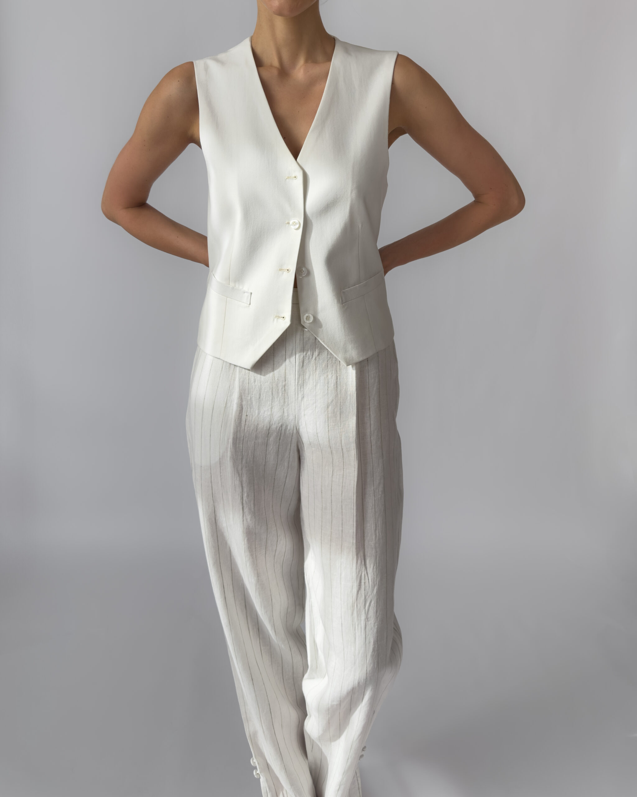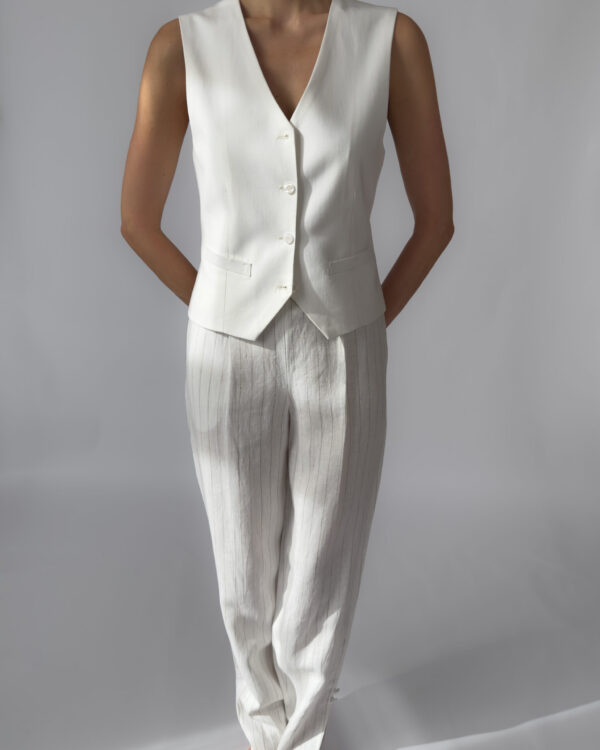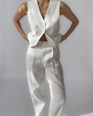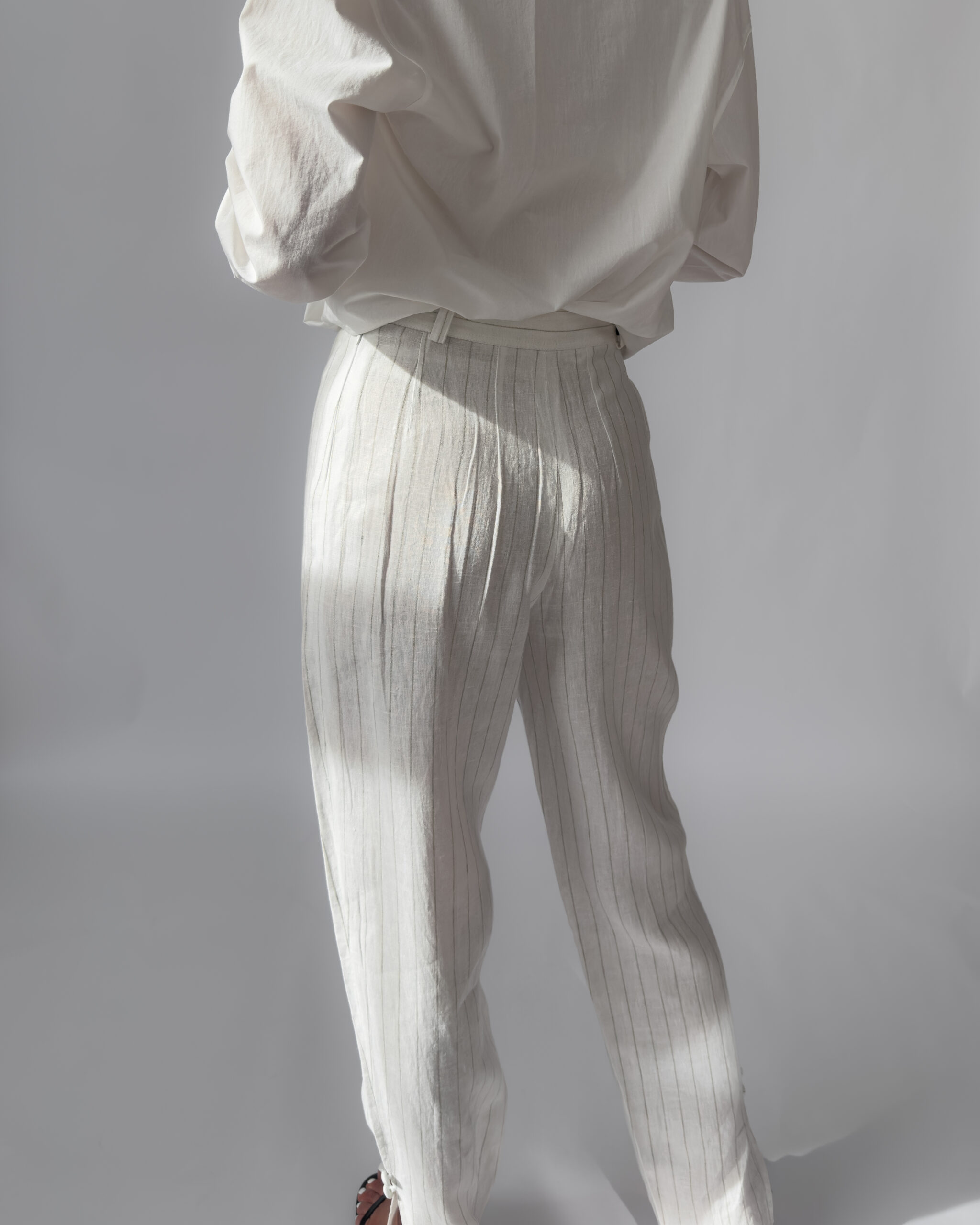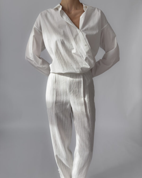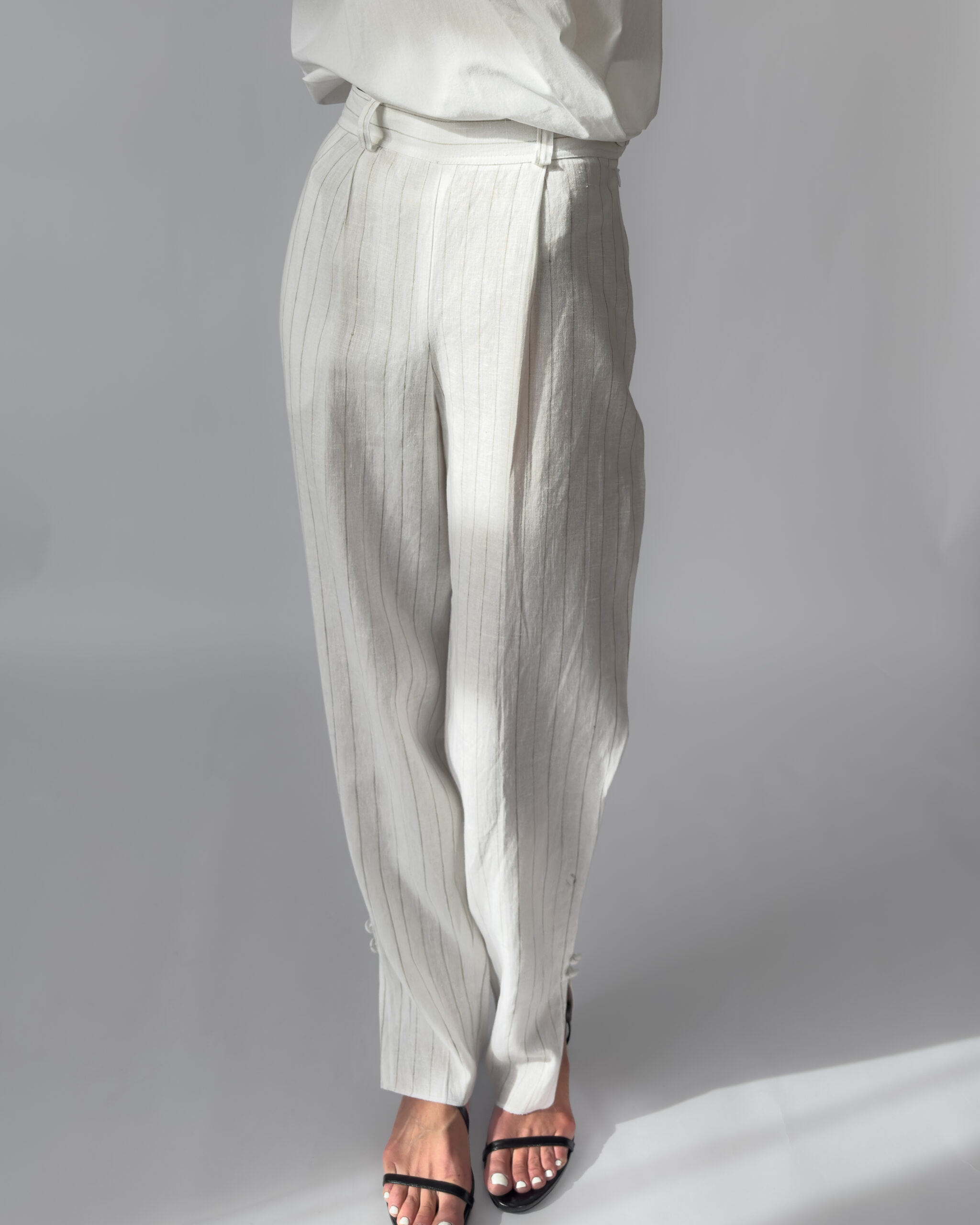 Elegant high-rise linen trousers with subtle pinstripes. Features a side zipper closure, belt loops, and small slits at the outer ankle. 100% linen, lightweight and breathable. Like new condition.