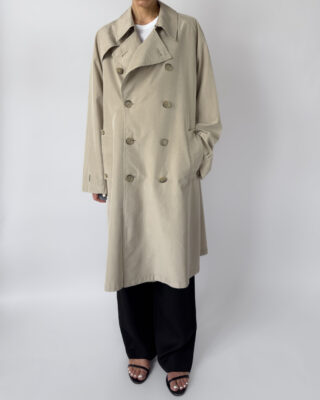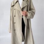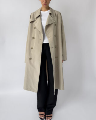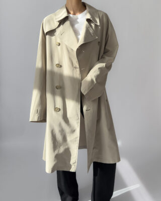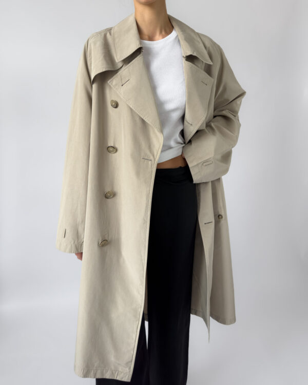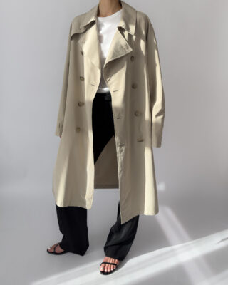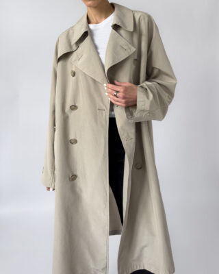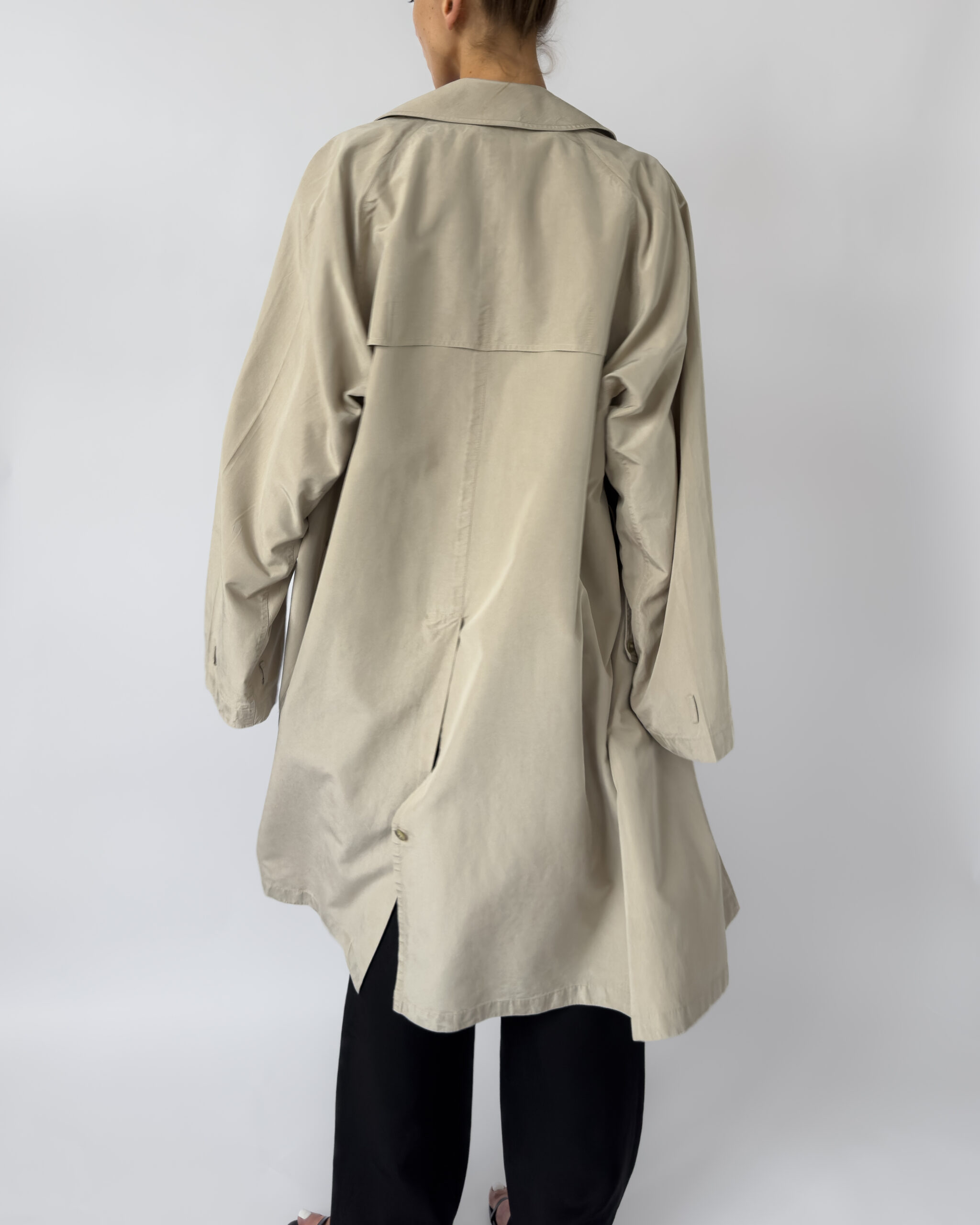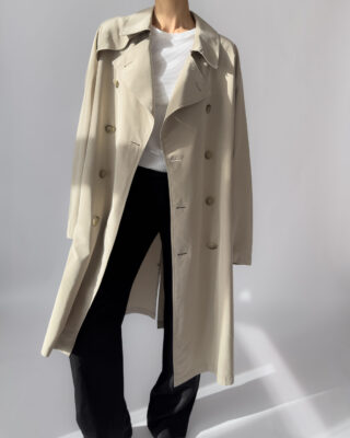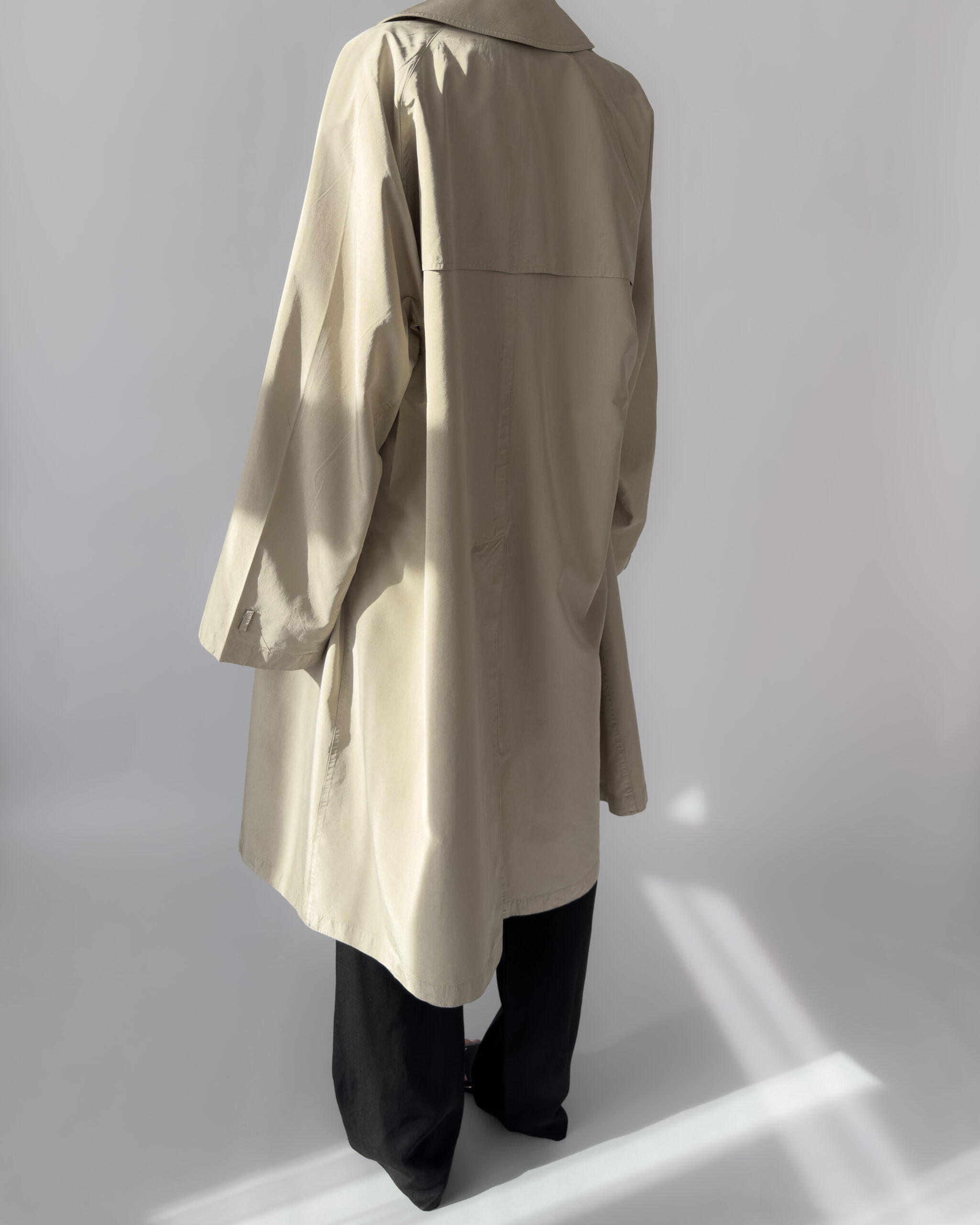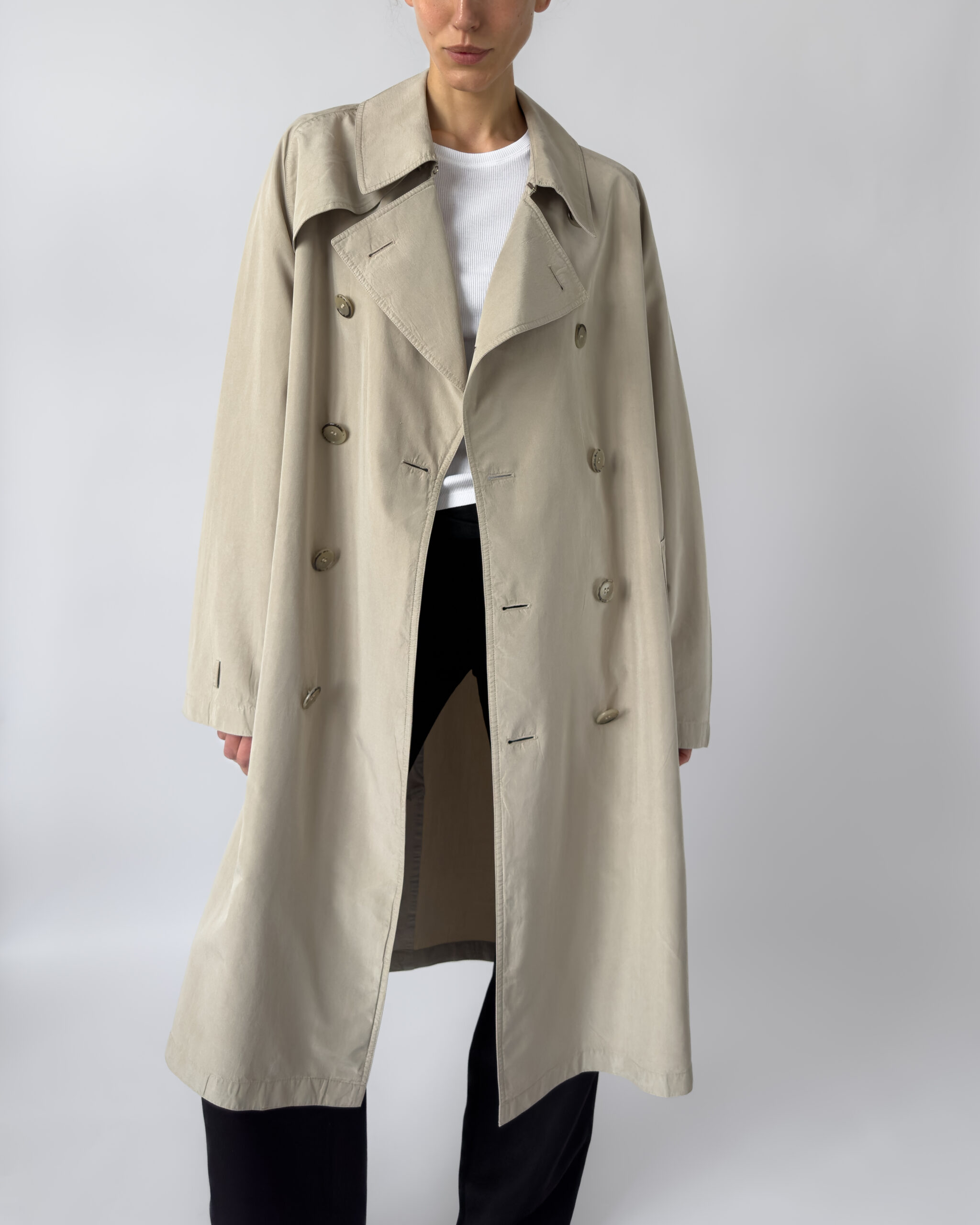 E. Braun & Co double-breasted trench coat in soft beige silk. Features a button-up front, wide collar, two front pockets, and a back slit. A timeless, lightweight layer perfect for transitional seasons.