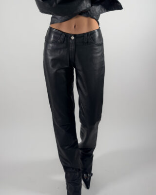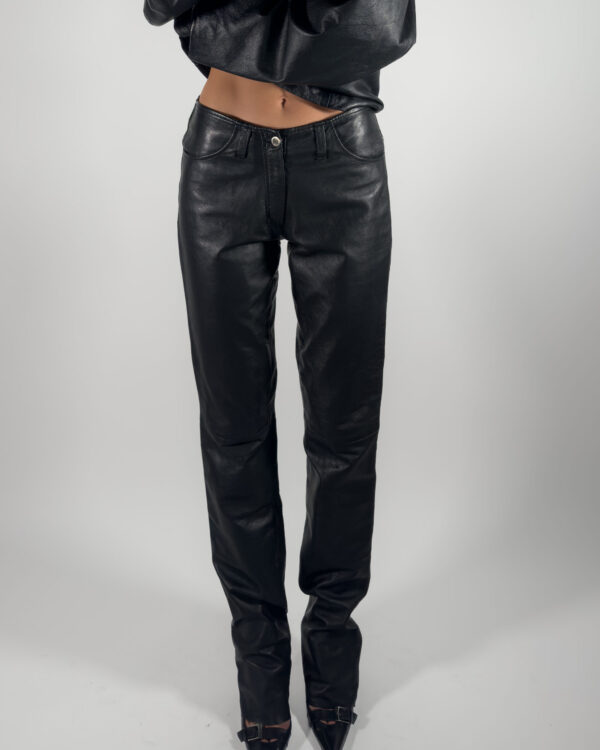 Sleek black leather trousers by RocoBaroco, designed with a low-rise fit and straight-leg cut. Fully lined with viscose, made from 100% leather.