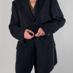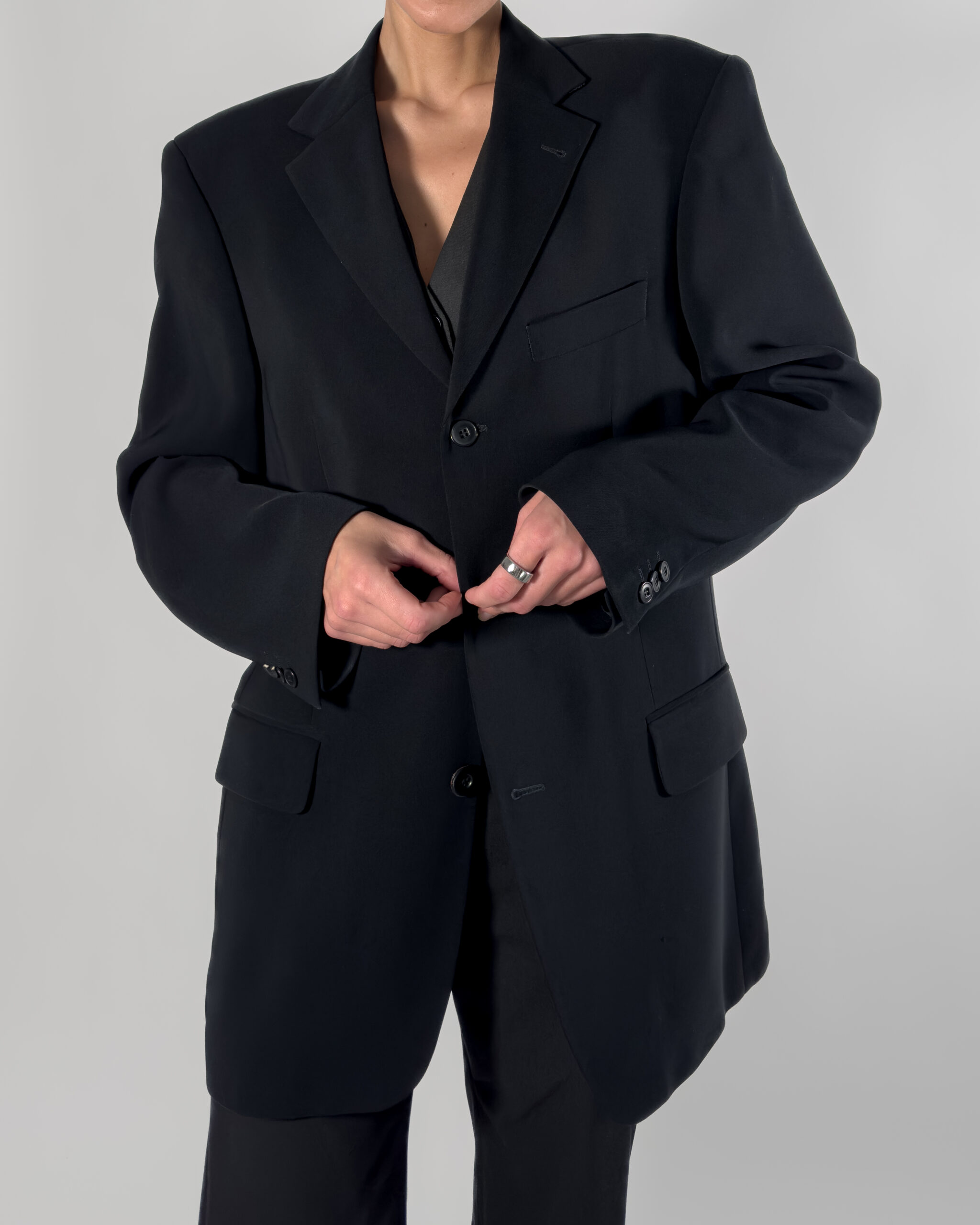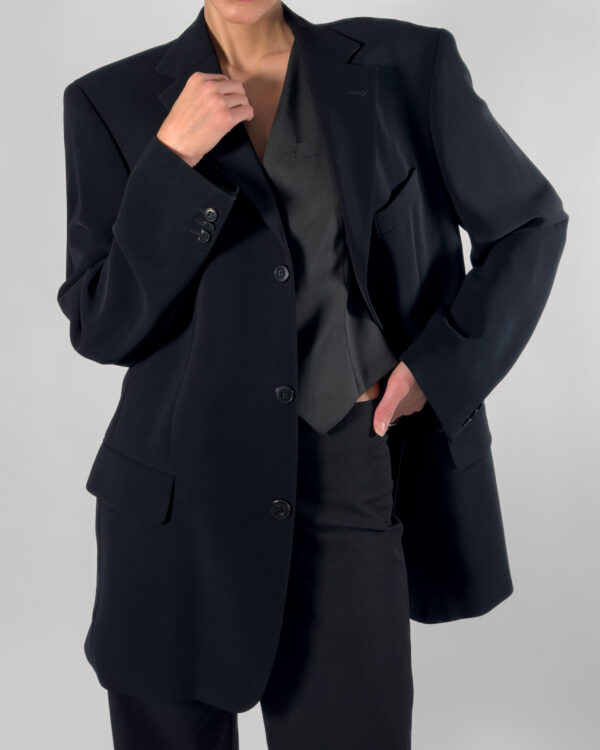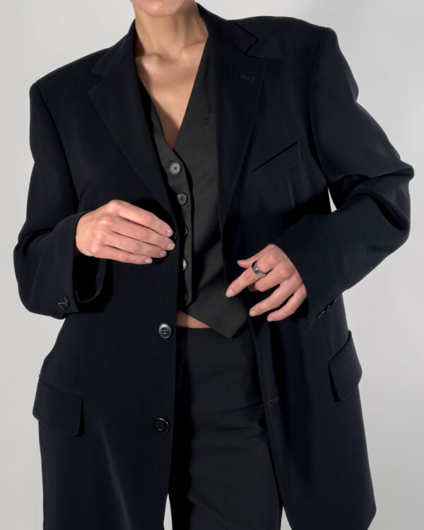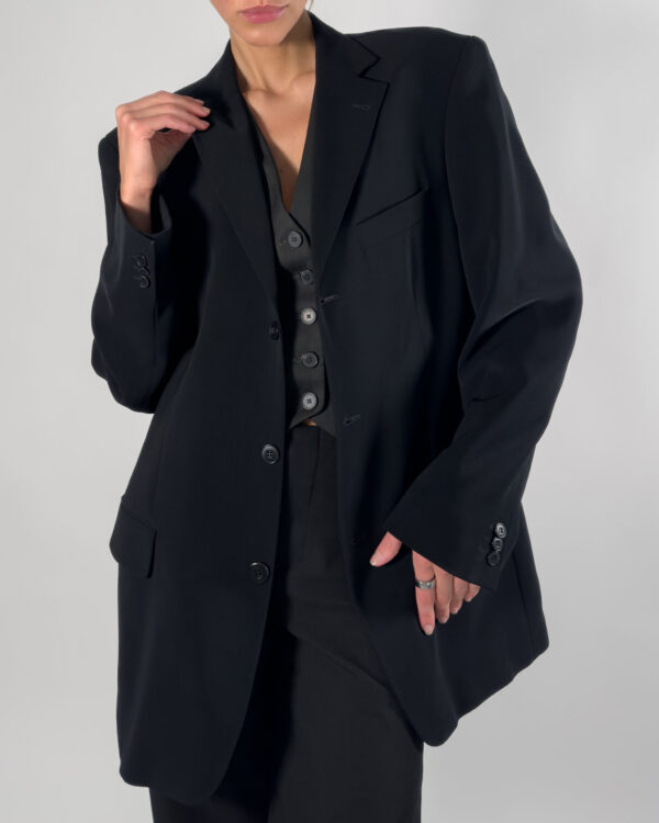 This classic black blazer by Sand features a button-up closure, structured shoulder pads, and practical inner pockets. Made in Europe.