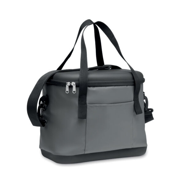 Cooler bag in 50C tarpaulin and top/bottom in rigid PEVA and bottle opener on the side. Including 1 front pocket and 1 inner mesh pocket. Isolation material: PE foam layer. Includes 2 handles and 1 adjustable and detachable strap. Capacity 16L.