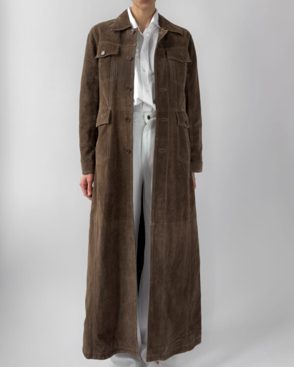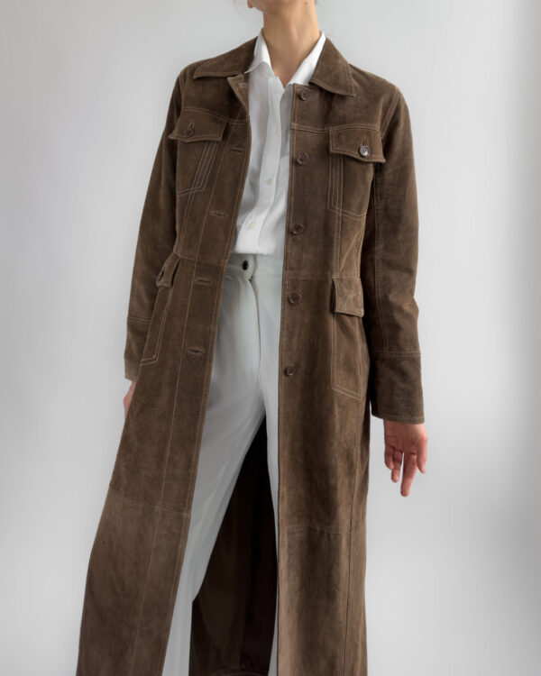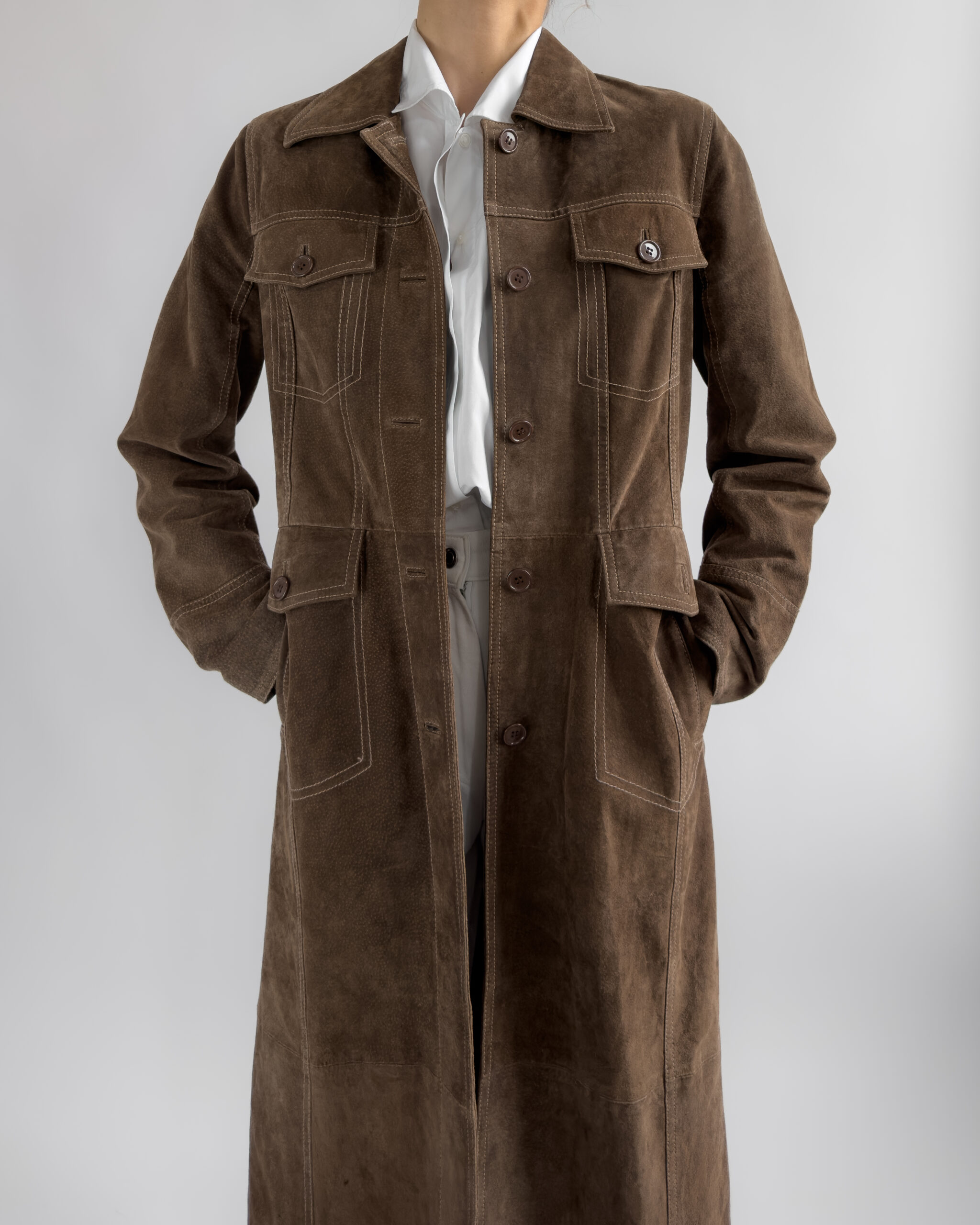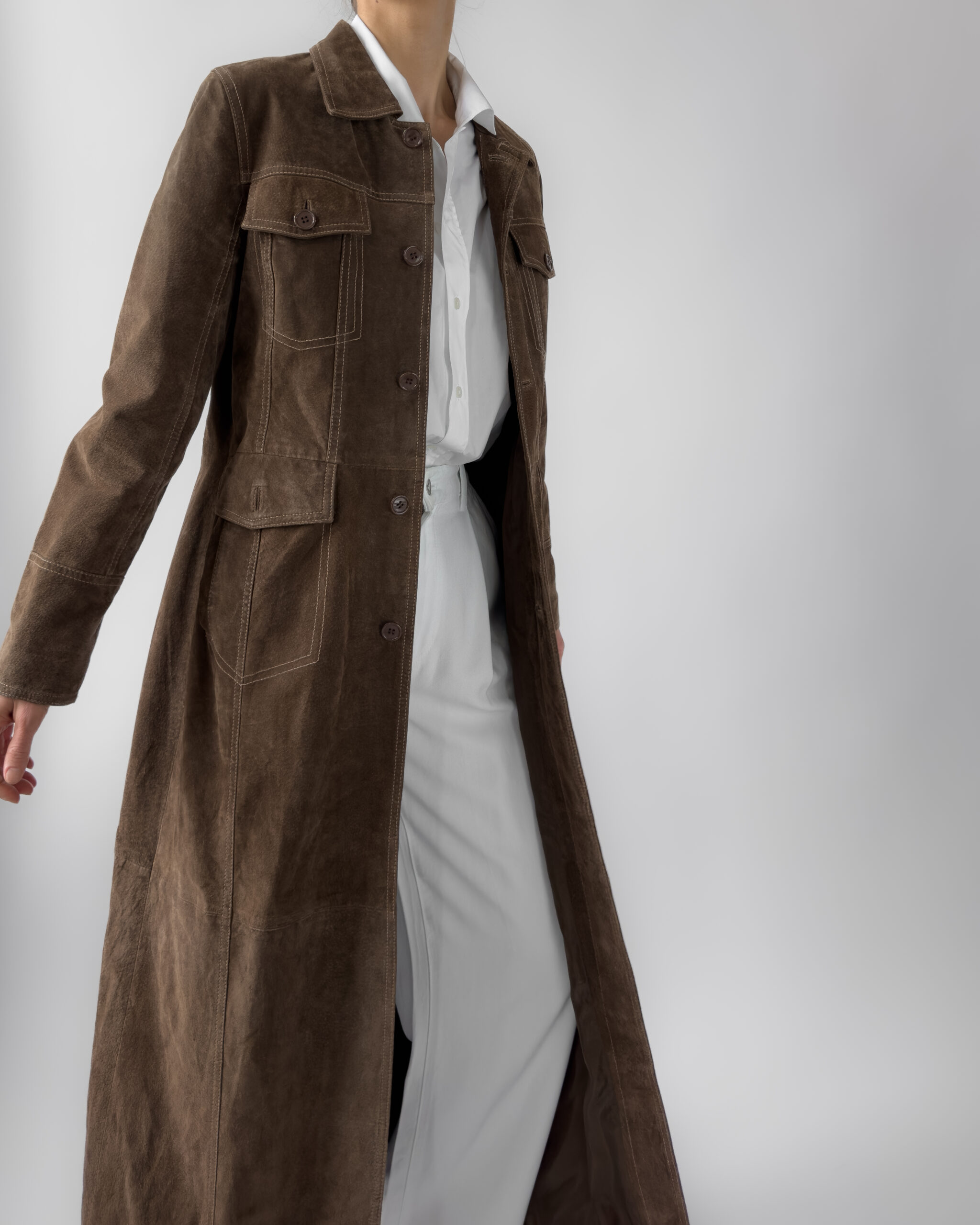 Longline suede coat with a structured silhouette. Made from soft genuine leather in a rich brown tone, it features a full button closure, front flap pockets, and tonal stitching throughout. The full-length cut adds understated drama.