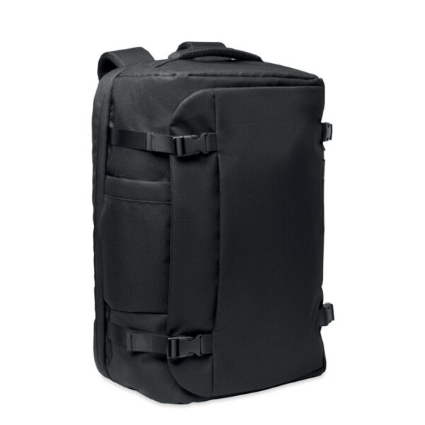 Large travel 17 inch laptop backpack in 600D RPET polyester. Features several compartments as one main for clothes, two padded for laptop, tablet and more. Padded back panel, shoulder strap, hand grip.